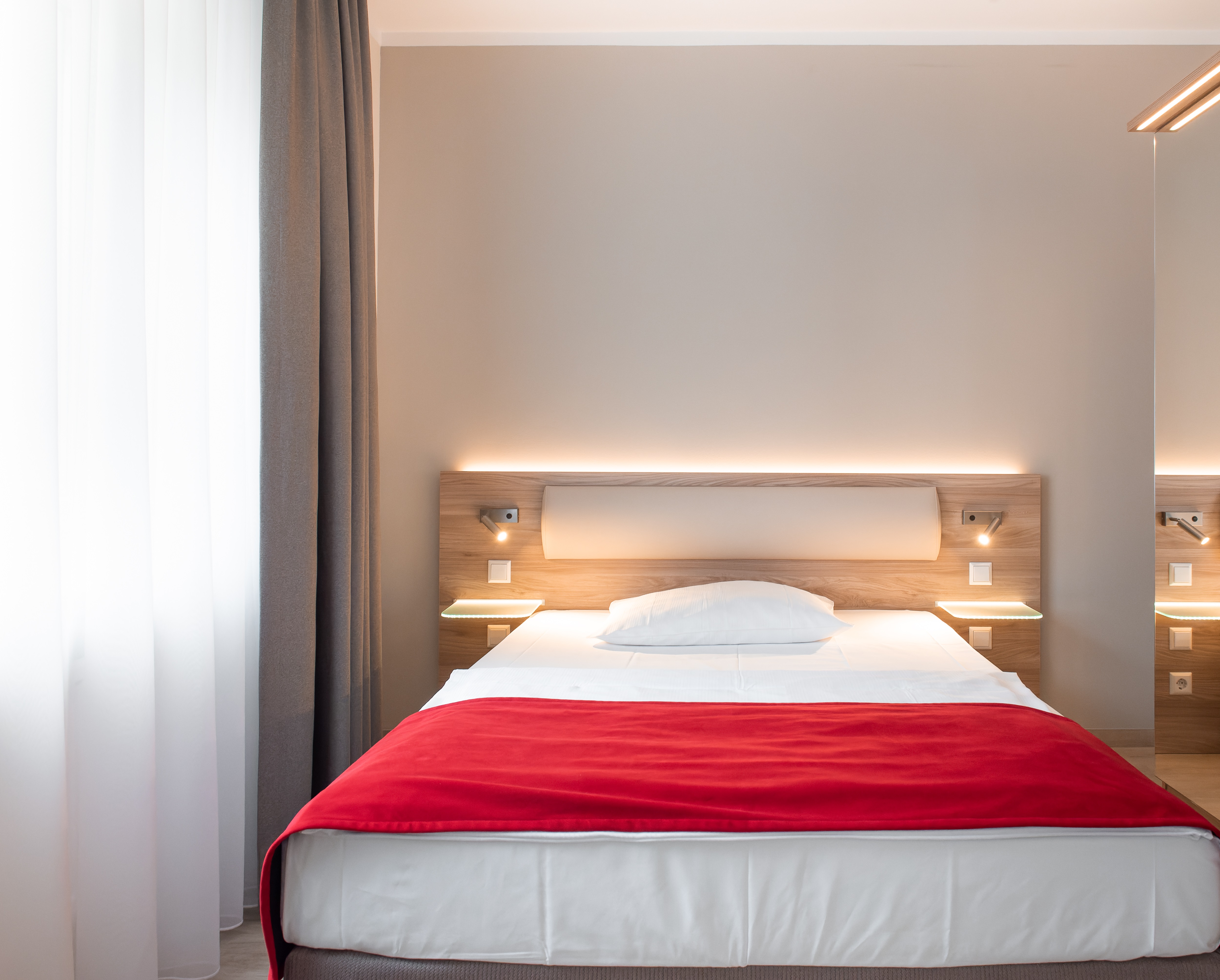 With a size of approx. 25 to 30 m², our comfortable deluxe double rooms offer plenty of space to relax and feel at home. Equipped with a generous 2 m wide and 2.10 m long double bed, they impress with their modern design and stylish details. The facilities also include a spacious desk, a bathroom with shower, WC, flat-screen TV, free Wi-Fi, telephone, mini fridge and hairdryer. Some rooms also have a smoker-friendly balcony - ideal for a little break in between.