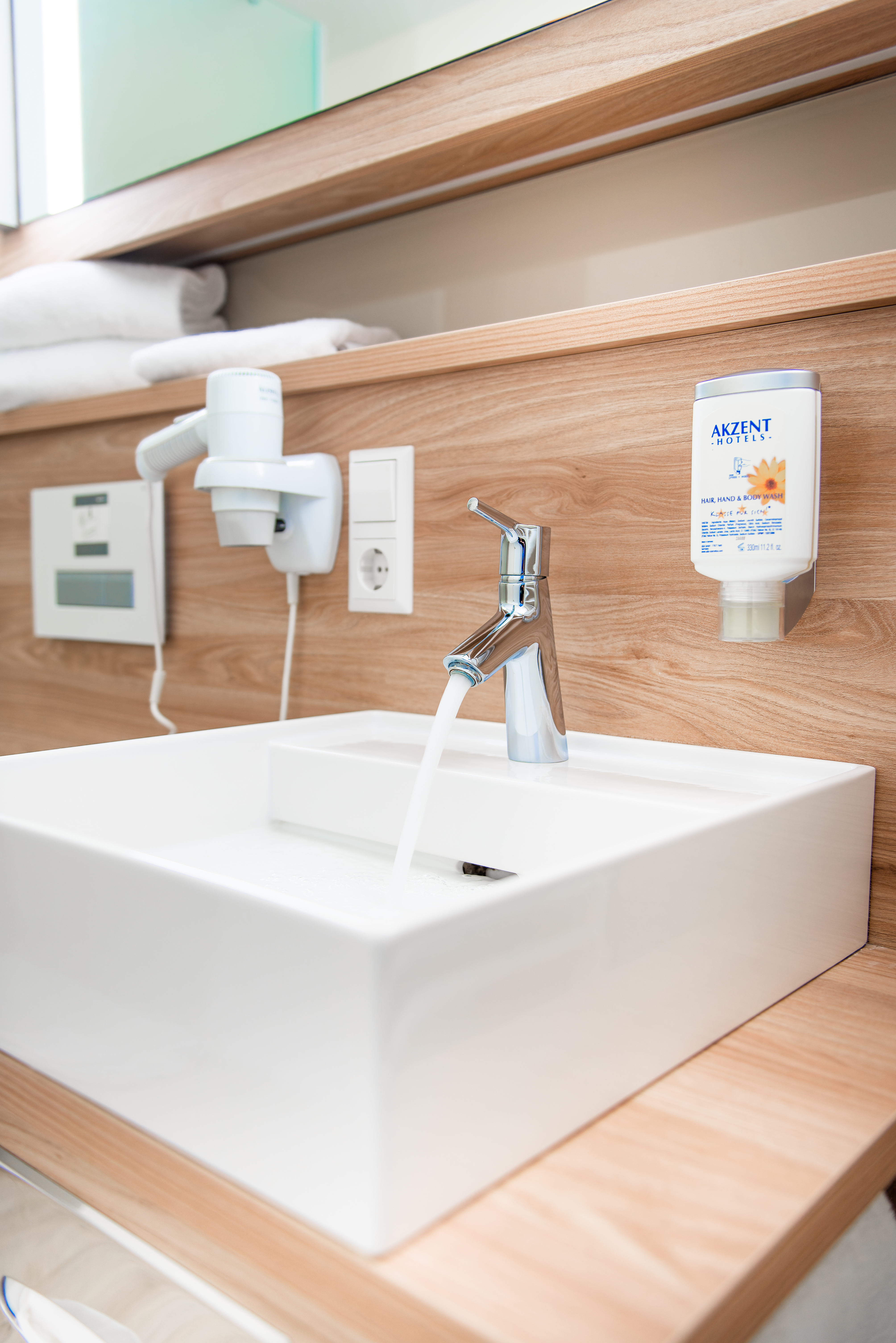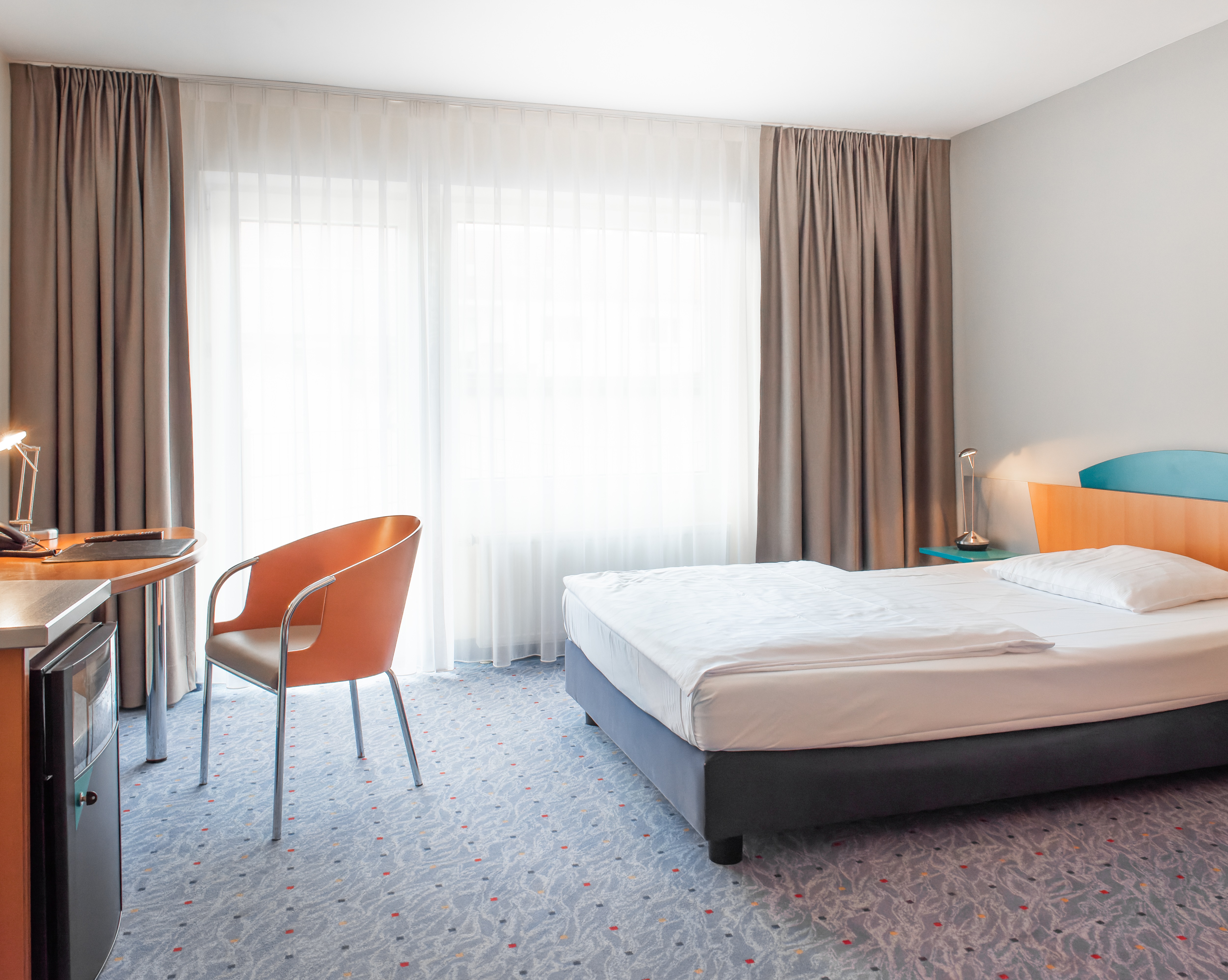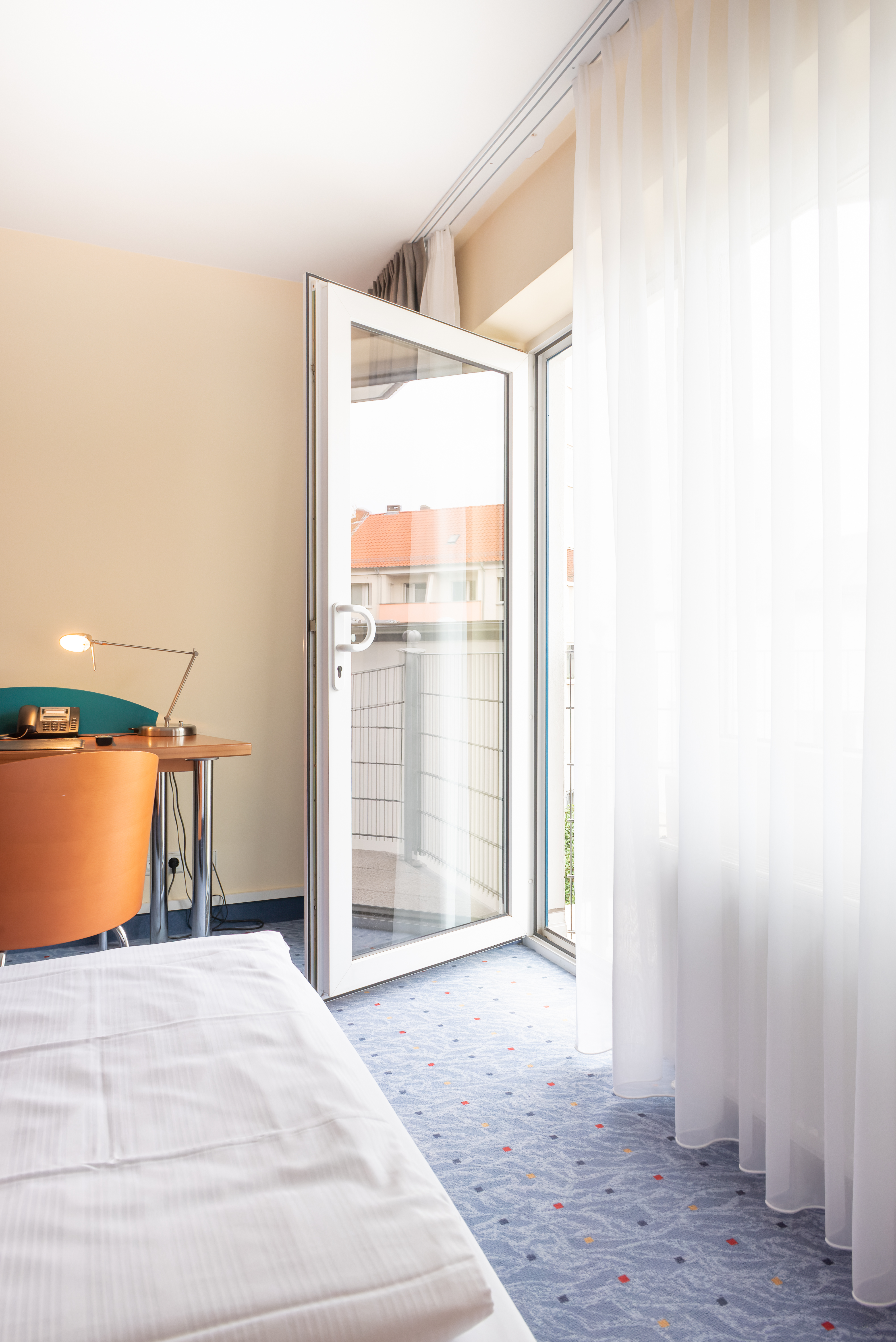 Our approx. 21 - 25 m² business rooms are modernly furnished and perfect for concentrated work and a relaxed arrival. With a 1.40 m wide bed, large desk and bathroom with shower and WC, flat-screen TV, WiFi, telephone, mini fridge and hairdryer, you'll find everything you need. Some rooms also have a smoker-friendly balcony.
