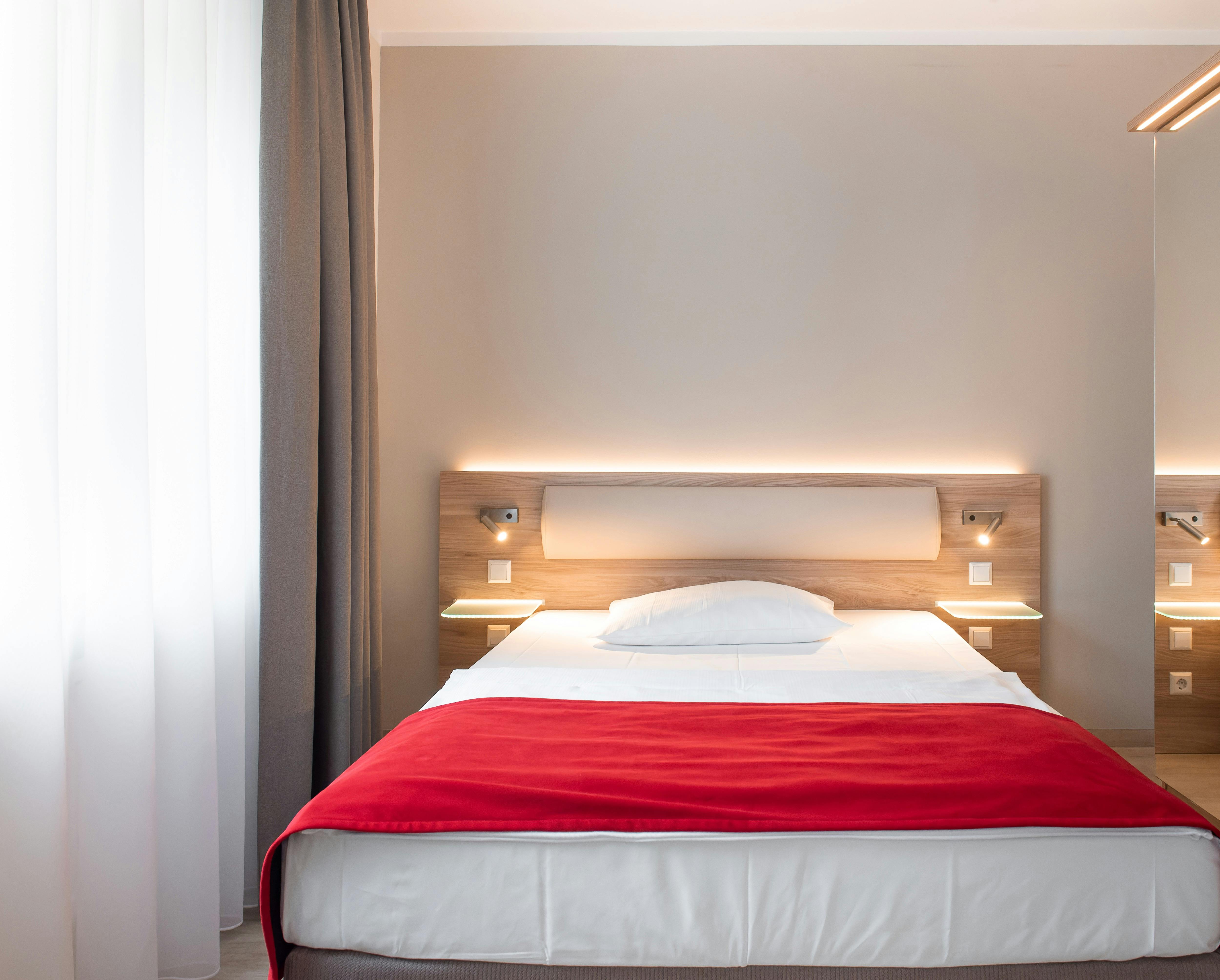 Our approx. 21 - 25 m² business rooms are modernly furnished and perfect for concentrated work and a relaxed arrival. With a 1.40 m wide bed, large desk and bathroom with shower and WC, flat-screen TV, WiFi, telephone, mini fridge and hairdryer, you'll find everything you need. Some rooms also have a smoker-friendly balcony.